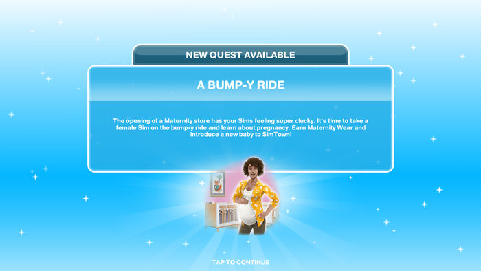 A Bump-Y Ride Quest is a quest that will make sims experience pregnancy. In this Quest, you will be explained about pregnancy in The Sims Freeplay. Sims who are not married or do not have any relationship can also get pregnant !!